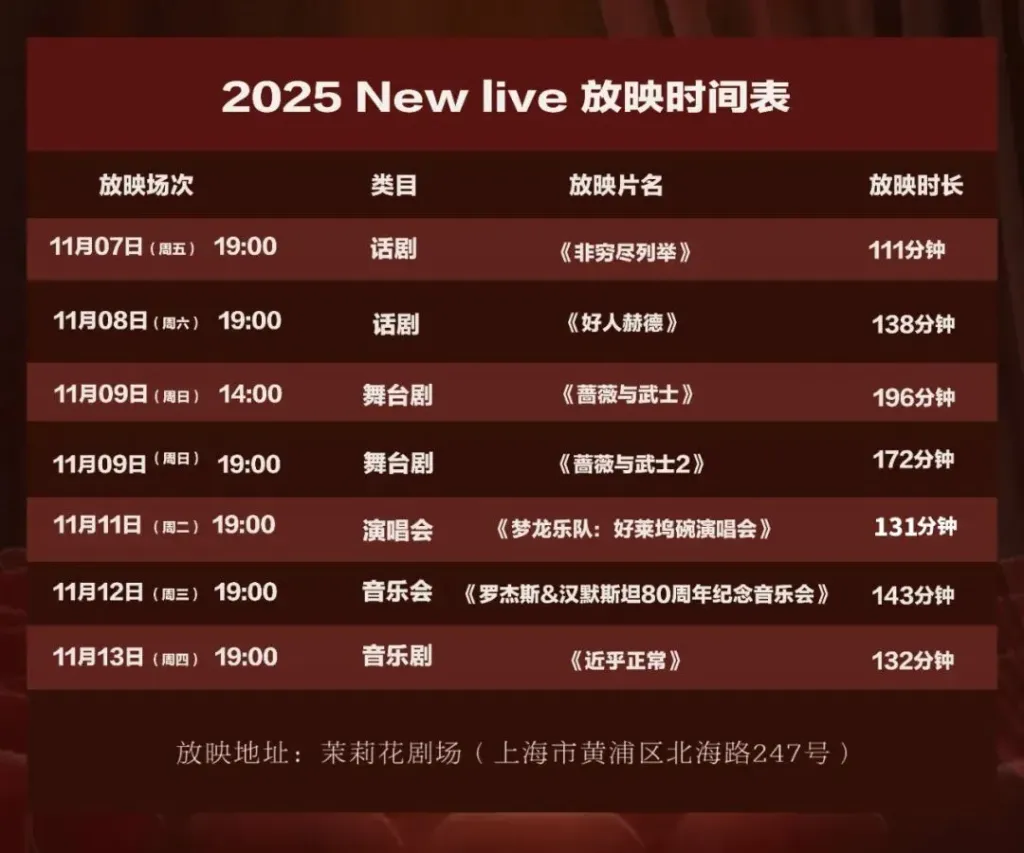 上周末,随着上海话剧艺术中心·茉莉花剧场宣布2025NewLive新现场高清放映回归,上海观众翘首以盼的高清放映又回来了。