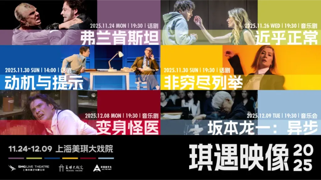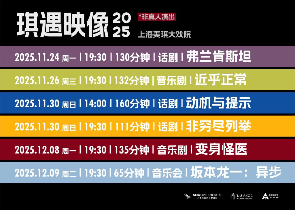 本次“琪遇映像”将从11月底开始,在6部高清影像放映中,特别甄选了2部曾在美琪大戏院大放光彩的经典高清影像作品——《弗兰肯斯坦》和《坂本龙一:异步·纽约公园大道军械库首演》,以此实现这一长达8年的高清影像回望。此外,话剧《动机与提示》、音乐剧《近乎正常》《变身怪医》也都是近两年热门的口碑佳作。放映同时,主办方还将邀请到各领域大咖来担任交流嘉宾。